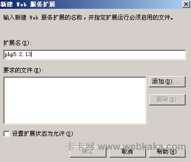 接著會出現“新建Web服務擴展”窗口,在“擴展名”中輸入“php”,然后點擊里面的“添加”按鈕,把C:\php\php5isapi.dll 添加到里面去,(注:C:\php 是php文件目錄)。最后把“設置擴展狀態為運行”勾上(也就是啟用對PHP文件的支持),確定便可。現在可以在“Web 服務擴展”列表中看到剛剛添加的項目了。