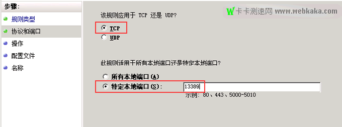 4、選擇“TCP”,端口選擇“特定本地端口”,手動輸入你剛設置的遠程端口號,點擊下一步。