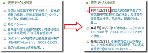 WP博客好像默認就在側欄的“最新評論及回復”里顯示評論人姓名,而我發現很多Z-Blog也被處理過,讓側欄的“最新評論及回復”也顯示了評論人姓名,我想這也是評論人所喜歡看到的效果吧。