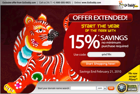 毫無疑問,GoDaddy這次優惠碼推廣瞄準的是中國用戶,在我們馬上過年的時候,給我們發的推廣信中,背景竟然是只非常生猛的老虎!