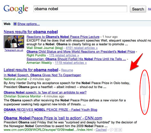 今天看到報道稱,Google已經在搜索結果中使用了即時信息,這些即時信息來自twitter、facebook等網站的更新。例如你用obama nobel作關鍵詞搜索,就會看到搜索結果中出現一條下拉滾動條,里面是來自twitter、facebook等網站的更新,這些更新都是動態的即時的。