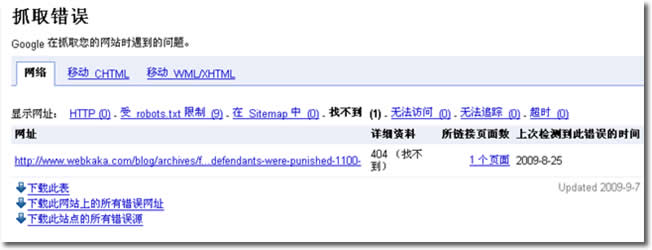 向Google提交Sitemap,還有一個很大的好處,就是Google能檢測你提交的頁面的內外部連接訪問錯誤。