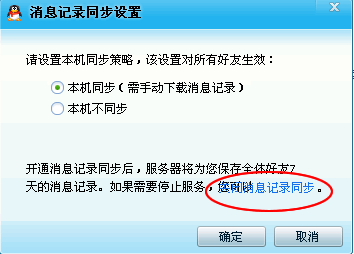 開通同步后,會看到“消息記錄”底部多了“同步”和“設(shè)置”兩個連接文字,我們可以設(shè)置同步策略,選擇本機(jī)消息是否同步