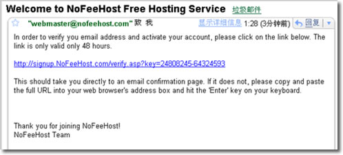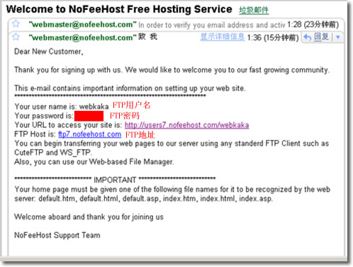 9、雖然NoFeeHost后臺提供上傳文件功能,但我們應(yīng)該使用FTP來管理自己的網(wǎng)站文件,那樣安全又方便。打開自己的郵箱,那里你會看到NoFeeHost給你發(fā)來的FTP資料,如圖所示