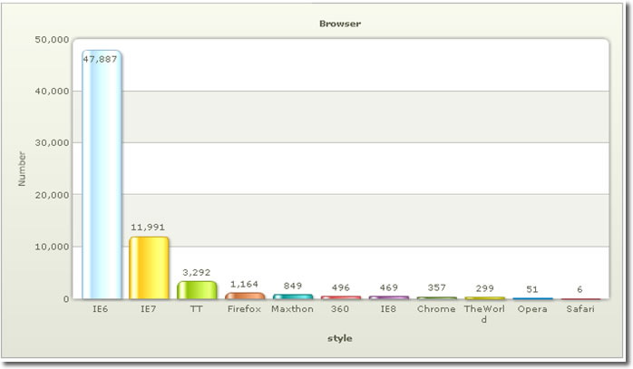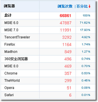 數據顯示,IE6的使用者數量還是牢牢占據第一的位置,而且比其他瀏覽器還高出很大一截,幾年內肯定不會改變。