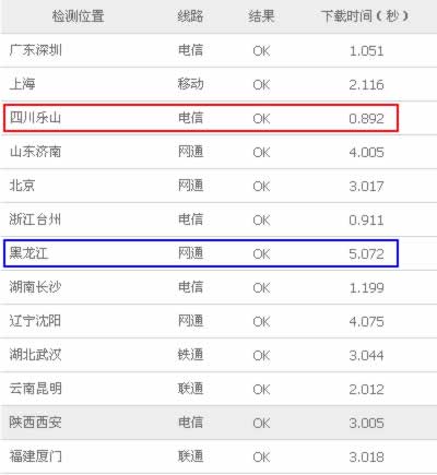 從網站全國各地打開速度的測試結果來看,全國平均速度為2.571秒,最慢的是黑龍江網通,需要5.072秒,最快的是四川樂山電信,需要0.892秒。而從線路分析結果來看,電信平均速度為1.412秒,網通(聯通)平均速度為3.533秒,電信打開的速度明顯快于網通打開的速度。