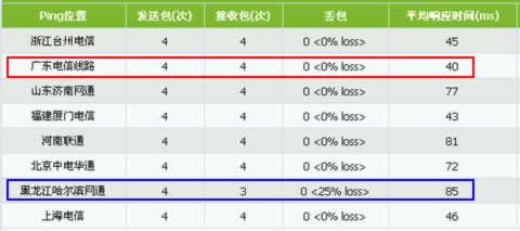 從網站全國各地PING測試的數據來看,PING值最大的是黑龍江網通,達到了85ms,并且,還有丟包的現象;PING值最小的是廣東電信,為40ms。從整體來看,電信線路的PING值要小于網通線路的PING值。