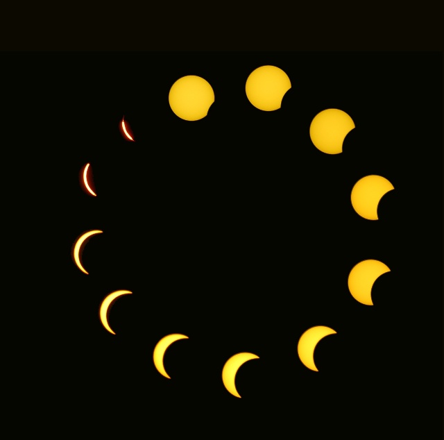 日全食的過程包括五個時期。初虧:月影剛開始侵蝕日面,即日食過程開始的時刻,此時為日偏食;食既:月影剛剛遮住整個日面,日全食開始,此時有一兩秒鐘的時間可以在日面邊緣看到一串亮點,這被稱為“貝利珠”,它們是由于月亮邊緣凹凸不平的山峰對陽光的散射而形成的;食甚:月影圓心與日面圓心距離最近,此時日光被遮的最嚴實;生光:月影剛劃出日面,此時日全食結束,又開始呈現日偏食,“貝利珠”在此時會再次出現;復圓:月影完全劃出日面,到此為止,日食過程完全結束。每次日全食時間最長7分多鐘,一般為2至3分鐘。