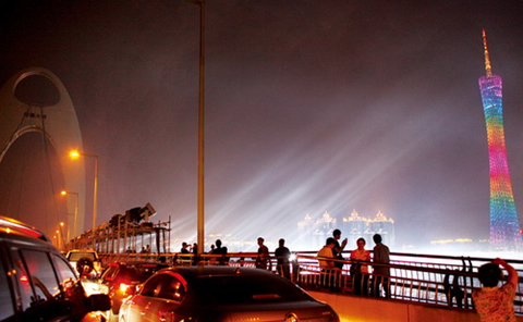 相對于煙花四起的開幕式會場來說,珠江左側的廣州塔,更為絢麗矚目,廣州塔高度達600米,為世界第一高電視塔;而珠江右側的“西塔”,則是廣州第一高樓——432米。“兩塔”高高聳立,金碧輝煌,相映成趣。