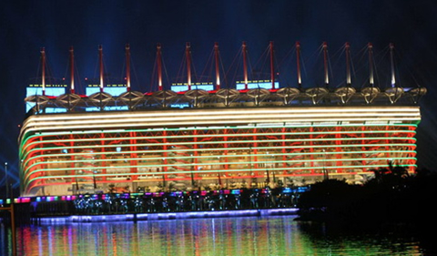 這是開幕式廣場俯視遠景圖,亞運會開幕式會場建于海心沙一個小島上,這個小島則座于珠江中。遠看有點別致而別具一格,驚艷、創意和動感,對水文化的使用是其一大特色。