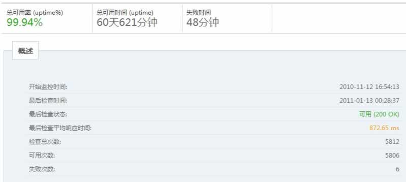 從上圖看出,總共60多天的監測中,在線率達到99.94%,這個在線率我覺得是很恐怖的。國內的空間,在線率我想沒人敢亮出來。