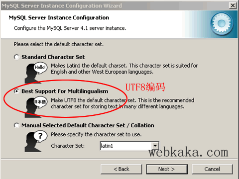 14、選擇數據庫默認編碼,我們選擇第二個選項,UTF8編碼