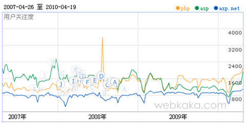 上圖為近3年的php,asp,asp.net用戶關注度比較,從圖中曲線圖看出,php在2008年下半年開始受更多用戶關注,從2008年下半年到2009年上半年,php與asp不分上下,受關注程度幾乎是一樣,而從2009年下半年開始,php受用戶關注度已經明顯超過了asp,而asp.net的用戶關注度僅僅為php的1/2。