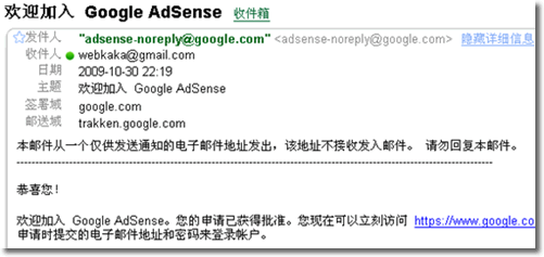 webkaka.com注冊剛好半年,今天就試著申請Google Adsense了,我本以為要1-2周才有回復的,想不到中午申請,晚上就回信說通過了。真是幸運!