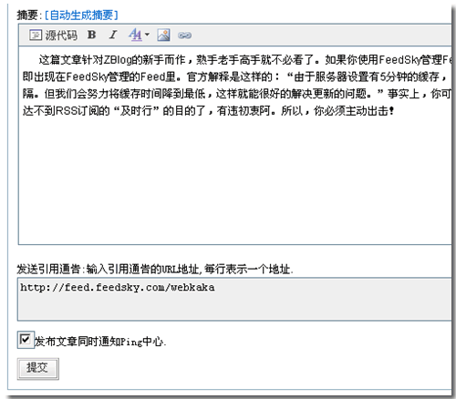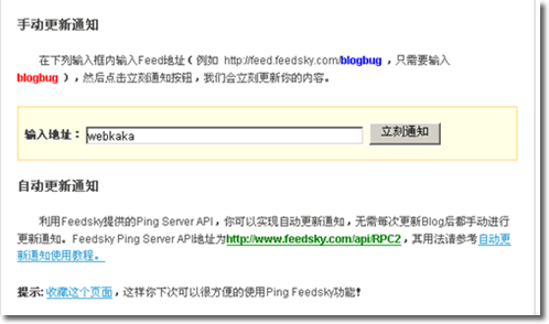 當你發布完文章之后,打開如下的網址:http://www.feedsky.com/ping.html,