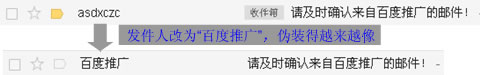 而發件人從隨意字母組合變成了“百度推廣”,偽裝得越來越像,不法分子非常聰明。