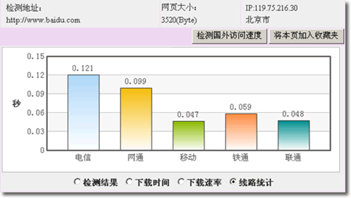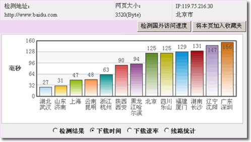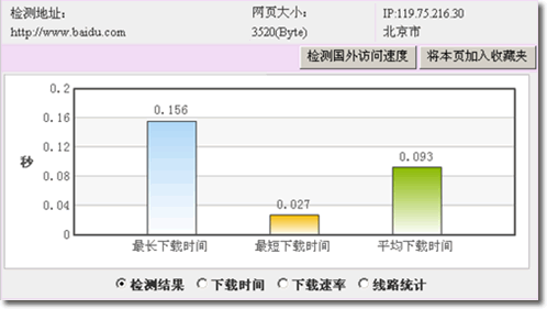 webkaka今天增加了一項新的功能,在網站檢測頁添加了統計分析圖,使用效果不錯。用戶在檢測完畢后可從統計圖里看到很直觀的結果,包括最長頁面下載時間、最短頁面下載時間、平均頁面下載時間;各地下載時間比較排序;各地下載速率比較排序;各線路下載時間比較。另外,加入了網站IP檢測以及網站所在地檢查。