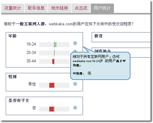 這里我感到疑惑的是,Alexa根據什么來判斷這些用戶群的歸類的?例如性別,Alexa怎么知道當前瀏覽網頁的人是男是女呢?是否有子女呢?瀏覽地點這項我這里為空,我想如果從IP所在地來判斷的話,這倒好統計,如果是指在網吧還是在學校還是在家里瀏覽,這個就比較復雜了吧?