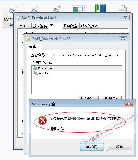 在win7上安裝IIS重寫插件 ISAPI_Rewrite ,安裝完畢,因為要復制 ISAPI_Rewrite.dll 文件覆蓋,首先要設置該文件的安全屬性,允許“修改”,但提示:無法保存對 ISAPI_Rewrite.dll 權限所作的更改。