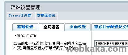 前兩天,我在為博客設(shè)置一些“全局變量”的時(shí)候,無意中發(fā)現(xiàn)了“BLOG CLSID”這個(gè)參數(shù),界面上是這么介紹的:“Blog的唯一標(biāo)識符,防止和同一空間其它Blog沖突,可隨意設(shè)置為字母或數(shù)字的組合。”