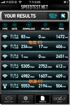 信號質量或者說上網網速是我們測試最為重要的內容。官方的參數,聯通 E5 支持下行最高速率 7.2 Mbps,上行 5.76 Mbps,而電信 E5 支持下行 3.1 Mbps,上行 1.8 Mbps。
