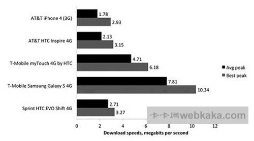 結果顯示,T-Mobile運營的兩款手機表現最佳,Galaxy S 4G創下10.34Mbps的極速,平均為7.81Mbps。myTouch 4G緊隨其后,成績分別為6.18和4.71Mbps。其余型號落后不少,但彼此較為接近。運行AT&T 3G網絡的iPhone 4平均速度、最高速度分別為1.78、2.93Mbps。