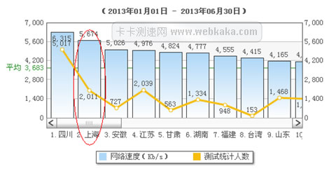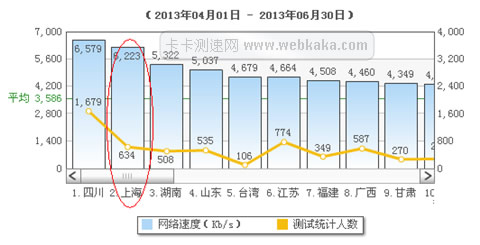 上圖為2013年6月份全國網速排名圖,上海已經跌到了第8名,平均網速僅為4997kb/s,只是排名第一位山東的70%。