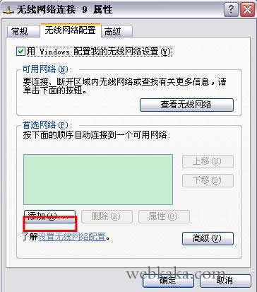 這時候點(diǎn)擊“更改高級設(shè)置”后出現(xiàn)無線網(wǎng)絡(luò)連接 屬性 對話框,在這里我們手動建立一個無線網(wǎng)絡(luò)以便我們連接到DIR-605上。如下圖所示,點(diǎn)擊“添加”。