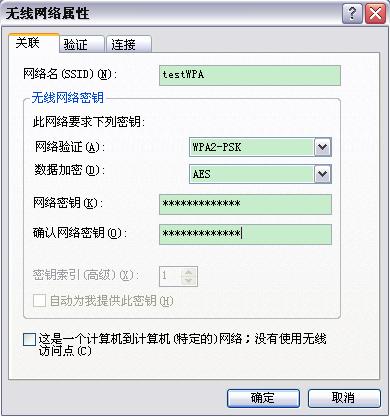 (2)無線網(wǎng)絡(luò)密鑰:網(wǎng)絡(luò)驗證選擇WPA2-PSK;數(shù)據(jù)加密選擇AES;然后再填寫在路由器上設(shè)置好的無線網(wǎng)絡(luò)密鑰并予以確認(rèn)。