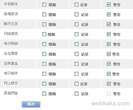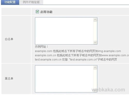 在通用網(wǎng)址分類管理界面中,可以輸入白名單和黑名單的列表,注意區(qū)分整站域名還是頻道鏈接,比如目前很多企業(yè)都禁止用戶訪問開心網(wǎng),在黑名單中加入該網(wǎng)址即可。