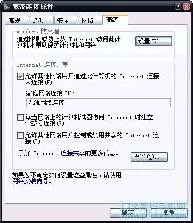 要讓手機通過筆記本無線共享上網,可在已通過ADSL PPPoE撥號上網的那臺電腦上,依次打開“網絡連接→共享連接→網絡任務→改變此連接的設置”。在“高級”標簽上,選中“允許其他網絡用戶通過此電腦的Internet連接進行連接”復選框,并可啟用“讓其他用戶控制或啟用此連接”復選框即可。