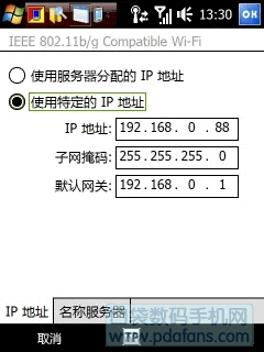 然后選中手機的無線網卡,在其配置界面中選擇“使用特定的IP地址”,將IP地址設為192.168.1.2(尾數為2-254間的數字,確保與主機和本局域網中的其它電腦不同),子網掩碼為默認的255.255.255.0,默認網關為主機的IP地址即192.168.1.1。兩款設備間即可實現互聯。