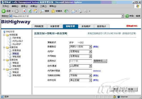 3、在“流量控制”-“策略組”中新建一個策略,在“數據路徑”中選擇“網橋1->雙向”,在“應用協議”中選擇“P2P下載”,在“動作/通道”中選擇“p2p限制”。這樣就在局域網中將所有應用P2P的下載所占用的帶寬限制到10M,如圖所示。