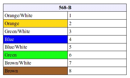 標準568B(金屬線朝正前方時):橙白--1,橙--2,綠白--3,藍--4,藍白--5,綠--6,棕白--7,棕--8