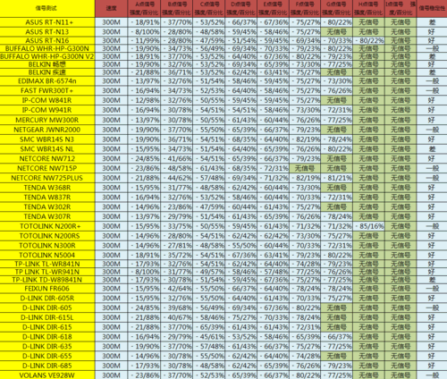 回到正題,I點沒只有一款產品可以達到,這和54M橫評結果一樣;H點只有TOTOLINK和華碩的兩款產品;G點上有超過30%多的產品無信號;在F點上有一款產品無信號,這就是表現最差的磊科NW715P,至于一些信號細節強弱問題,細心的讀者可以自行斟酌對比。