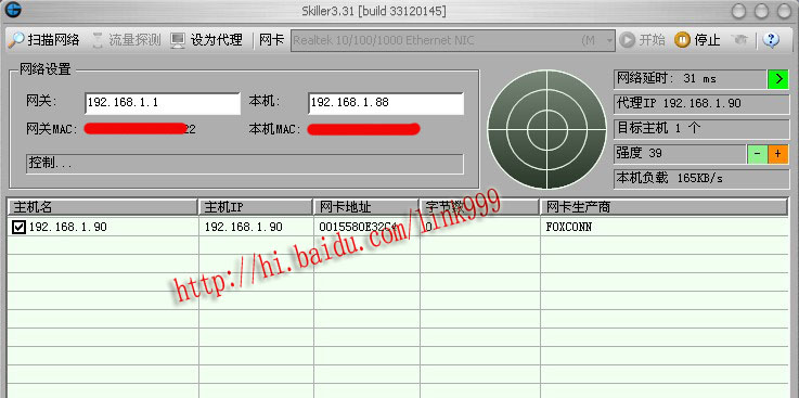 很簡單,打開SKILLER,就會出現上面的面板,其中探測的有2種方式,掃描網絡和流量探測,前一種主要是主動的發送ARP包來探測別的主機,容易被別的主機所發現,因此不建議大家使用,一般來說,用流量探測就足夠了,比如目前在我的局域網內有2臺主機(自己的不顯示),你想要控制哪一臺的網速就要在那臺主機的前面打上鉤,再點擊開始,你就對這臺主機實施控制了,如圖:
