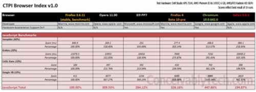 本次選取的測試平臺為Dell XPS 7100,運行Windows 7操作系統(tǒng)。測試結果選取Firefox 3.6.11為基準1,便于比較各瀏覽器間的得分。測試對象還選取了Opera11、IE 9 PPV7、Firefox 4 beta 10-pre、Chrome 10、Safari 5.0.3。在下面的Javascript測試中,包含了四項權重不同的子測試:Webkit Sunspider (60%), Mozilla Kraken (20%), Google V8 (10%) and Celtic Kane (10%)。