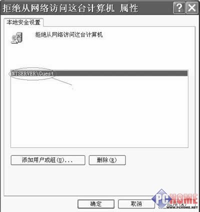 在WinXP中默認情況下是拒絕Guest用戶從網絡訪問本機的。可以到“控制面板/管理工具/本地安全策略/本地策略/用戶權限指派/拒絕從網絡訪問這臺計算機”查看,若其中包括Guest用戶便將其刪除(圖5)。如果是在建有域的Win2000 Server或WinXP.net服務器上,還必須在“域安全策略”的相應項目中將Guest用戶刪除,需要注意的是刪除后要等幾分鐘才能奏效。