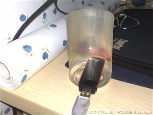 用USB延長線把3G上網(wǎng)卡接出來,放到剪好的易拉罐中
