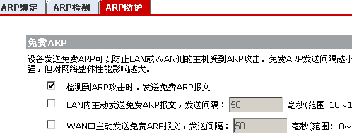 ARP病毒一旦爆發(fā),往往會造成大量電腦無法上網,ARP問題的根源其實是由于ARP協(xié)議缺乏相應的安全機制。在內網部署可管理型交換機可徹底消除與ARP相關的各種問題,然而,購置交換機將是一筆不小的開支。面向中小企業(yè)市場的路由器產品都提供了這樣一種機制防御ARP攻擊:向內網發(fā)送免費ARP報文。啟用“ARP防護”功能后,ER2100會向局域網內發(fā)送ARP包,通過這種方式不停刷新客戶機上ARP緩存中的IP MAC映射表來達到抑制ARP欺騙的目的。