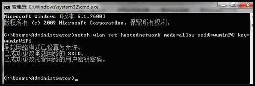 運行命令:netsh wlan set hostednetwork mode=allow ssid=wuminPC key=wuminWiFi(注意:上邊命令"ssid"后為網絡名稱,自己隨便命名,比如wuminPC可改為MyWiFi等等,自己喜歡怎么命名都行."Key"后邊紅字為密碼,自己隨便命名,比如wuminWiFi 可以改為12345678,總之自己命名就可以了,不一定非得這個網絡名稱,這個密碼,密碼8位以上最好)