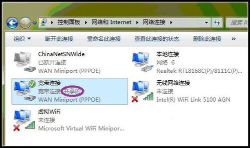 確定之后,提供共享的網卡圖標旁會出現“共享的”字樣,表示“寬帶連接”已共享至“虛擬WiFi。