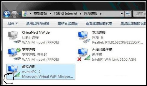 開啟成功,網絡連接中會多出一個網卡為“Microsoft Virtual WiFi Miniport Adapter”的無線。