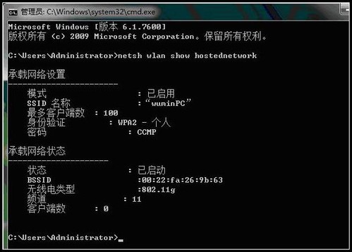 附:顯示無線網絡信息命令:netsh wlan show hostednetwork