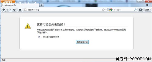 首先,要打開Direct2D特性,在Firefox 4.0 Beta4版(老版本Firefox沒有隱含此特性)的地址欄中輸入“about:config”然后敲回車,此時可以看到Firefox窗口中的警告提示,當然想接著往下操作必須要點“我保證會小心”。