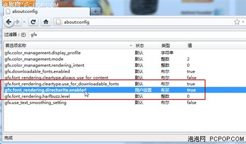 接下來尋找選項“gfx.font_rendering.directwrite.enabled”鼠標一點你將發現其默認值從false變成了true,關閉掉這個頁面,Firefox新版中隱藏的Direct2D特性就開啟了。