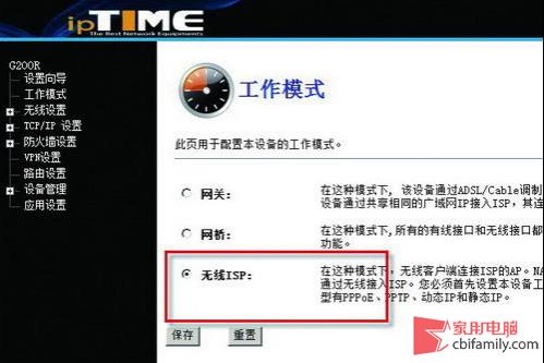 筆者把筆記本和無線路由器通過LAN口相連。打開瀏覽器,輸入http://192.168.0.1,進入管理界面,選擇工作模式。這里選擇“無線ISP”,點擊保存。