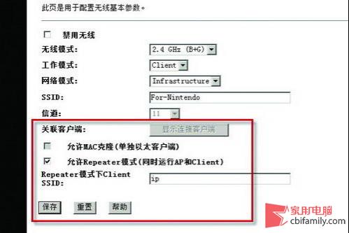 進入“無線設置”下的“基本設置”。這里選中“允許Repeater模式”,工作模式選擇為“Client”,然后給“Repeater模式下Client SSID”輸入一個新的名稱,如ip-time,再點擊保存。