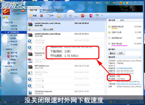 外網下載采用迅雷下載,下載一個58.24MB的文件,Tim少辦公室使用的是20Mbps的專線,下載速度可以達到2MB/s,可以看到關閉前和關閉速度基本上沒有變化,下載時間通用是33秒,下載曲線可以看到峰值基本相同,這里可以確定這個東西對于外網下載速度同樣不起作用。