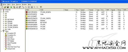 首先我們安裝netstumbler,然后選擇網卡進行掃描,從掃描到的結果中我們可以明顯看到有些網絡的SSID信息是空的,這些網絡就是隱藏了SSID廣播的無線網絡,例如本例中的MAC地址為001122334457的地址,不過就算他隱藏了SSID信息我們也可以通過netstumbler了解他的基本參數情況,例如通過后面的速度,類別,加密方式以及信號頻段等等信息我們可以了解到這個沒有廣播SSID的無線網絡具體參數信息。